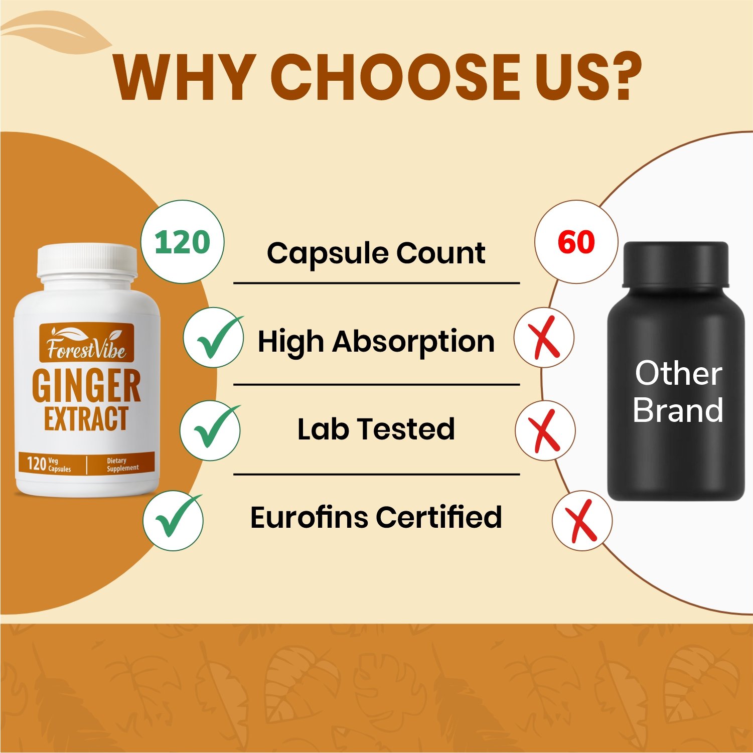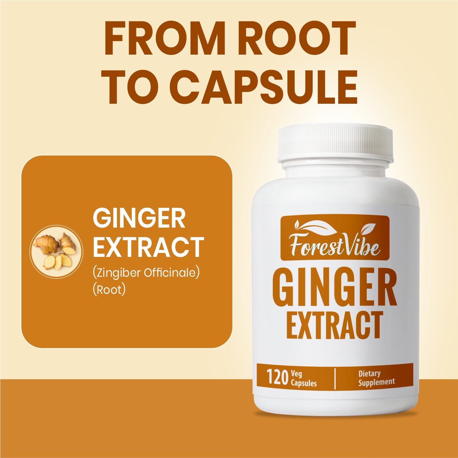 Experience ForestVibe Ginger Extract, featuring 120 vegan capsules with concentrated ginger root extract from Zingiber officinale. Produced in a GMP-certified facility and third-party lab tested for quality and purity.