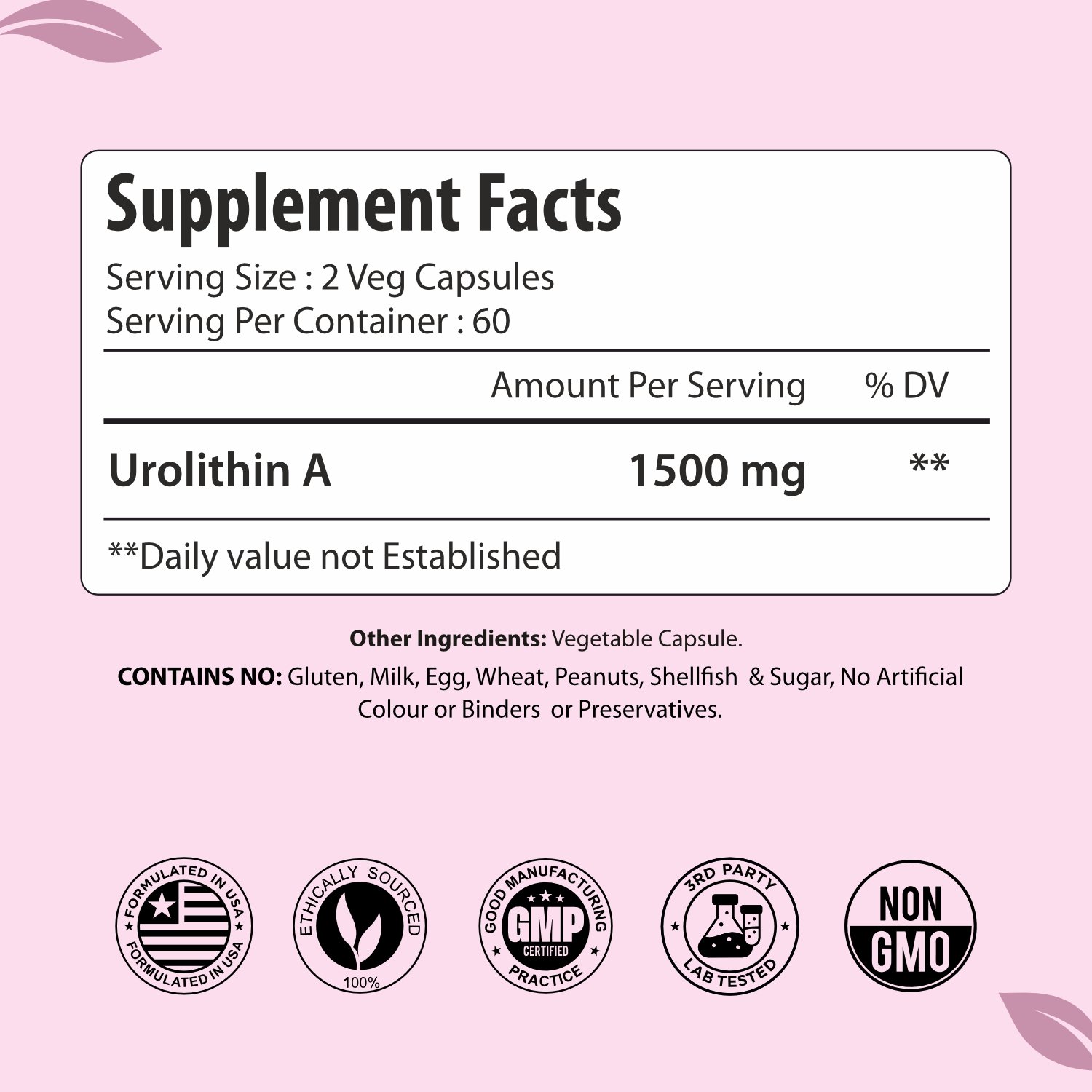 Take 2 vegetarian capsules daily with water, preferably with a meal, or as directed by a healthcare professional. Each serving provides 1500 mg of urolithin A. Use consistently as part of your daily wellness routine.